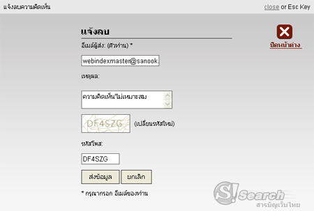 ที่อยู่ในความเห็นนั้น จากนั้นจะปรากฎหน้ากล่องเพื่อให้กรอกรายละเอียด และเหตุผลการแจ้งลบ ดังนี้