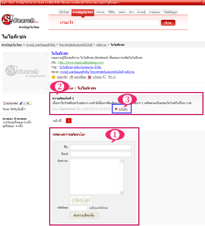 แสดงความคิดเห็น เป็นส่วนที่ผู้ใช้จะสามารถแสดงความคิดเห็น หรือสนทนาเกี่ยวกับเว็บไซต์นี้ได้ ทุกคนที่เข้ามาเยี่ยมชมหน้ารายละเอียดนี้แล้ว หากใครต้องการแสดงความคิดเห็น แนะนำอะไรเพิ่มเติมเกี่ยวกับเว็บไซต์นี้ ก็สามารถทำได้ง่าย ๆ เพียงแค่กรอก ชื่อ อีเมล์ ข้อความ (ความคิดเห็น) และรหัสป้องกัน จากนั้นคลิก ส่งความคิดเห็น